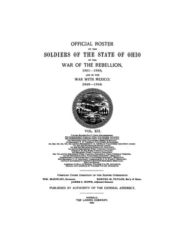 Volume 12 - United States Navy (Ohio Enlistments); 5th Independent Company Ohio Volunteer Cavalry; 6th Independent Company Ohio Volunteer Cavalry; 2nd Regiment Ohio Volunteer Reserve Militia; 1st Regiment US Veteran Volunteer Engineers; 1st, 2nd, 4th, 5th, 6th, 8th, and 9th Regiments US Veteran Volunteer Infantry (Part); 1st 2nd and 3rd Brigade Bands (Part); 1st and 2nd Regiments Kentucky Infantry; 1st and 2nd Regiments West Virginia Cavalry; Company H, 5th West Virginia Cavalry; 4th Regiment West Virginia Infantry; 5th, 7th, and 9th Regiments West Virginia Infantry (Ohio Veteran Credits); 1st-5th Regiments Ohio Volunteer Infantry (Mexican); Independent Companies Ohio Volunteer Infantry (Mexican); 15th Regiment US Infantry Companies B, C, D, H, and I (Mexican); Captain Sanderson's Company Mounted Riflemen (Mexican); Roll of Honor; Addenda to Roll of Honor, Volumes 1-11 Inclusive; Errata and Addenda to Volumes 1-11 Inclusive
