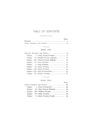 This book provides a genealogical and historical record of 160 years, extending from the 18th to the 20th century. Moses Freeman and his wife Nancy (Knight) were both born in England, married in London in 1762, and soon after they came to the British Colony of Maryland in North America. They settled on a farm in the eastern shore of the Chesapeake Bay, in Queen Anne County. In England they had both been brought up in connection with the Church of England, becoming full members; on coming to America they associated themselves with the Church of England in Maryland. Records are provided for four of their children, though they had more.