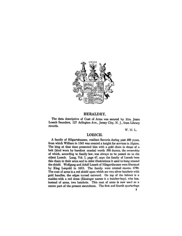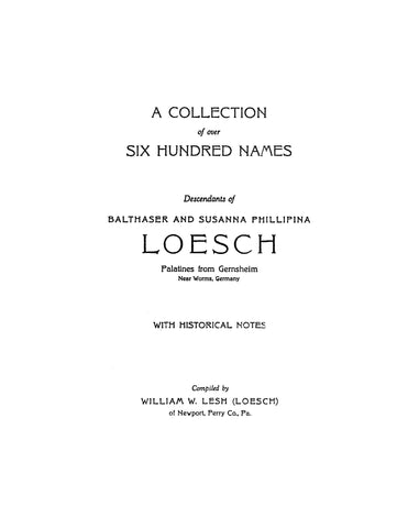 A collection of over six hundred names showing the descendants of Balthaser and Susanna Phillipina Loesch, Palatines from Gernsheim near Worms, Germany. They sailed for America from London, England Dec. 25, 1709. Many passengers died at sea during the voyage, among them was Balthaser, the father. The survivors reached New York in June, encamped in New York then moved from there to Berks County, Penna.