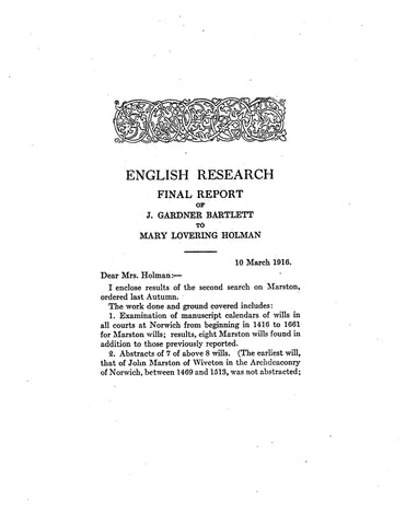In this publication we see 1. The sailing list of the ship Rose of Yarmouth, on 11 April 1637, for New England, names John Marston aged 20 years as servant of Mary Moulton of Ormesby. 2. A William Marston (b. about 1590) came from Norfolk about 1636 and settled in Hampton, New Hampshire. And a Robert Marston settled early in Hampton, N.H. and died in 1643...Wills in England show Henry Marston of Ormesday had son Robert, John, and Thomas, and probably William...