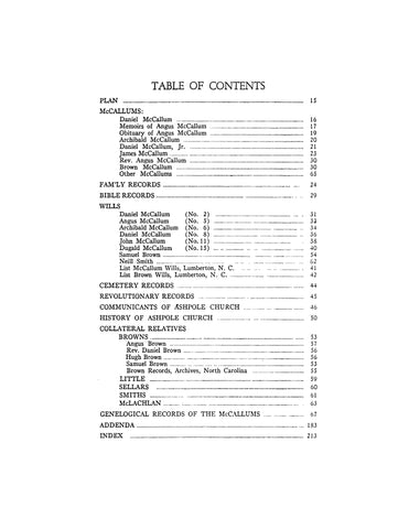 Daniel McCallum and Isabel Sellars: their antecedents, descendants and collateral relatives. Daniel McCallum, with his wife and children, emigrated to America from Kenteyre, (Cantire, Canteyre), Argyleshire, Scotland in 1770. After six weeks the company landed near Wilmington, NC. By the spring of 1771 he had lost his wife and children. It is not clear if they died enroute or during the first year. He settled in North Carolina. He later married Isabel Sellers. This book contains records on the coat of arms, wills, Revolutionary, church, genealogy, and cemetery records.