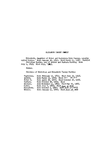 This short booklet outlines the history of the Christian and Elizabeth Yancey Martin family, who immigrated from France to northern New York, settling in Lewis County. They had eight children and engaged in various agricultural activities, including farming and dairy production. The genealogy details their descendants and significant life events, showcasing the family's resilience and contributions to the community. Typescript. (Softcover)