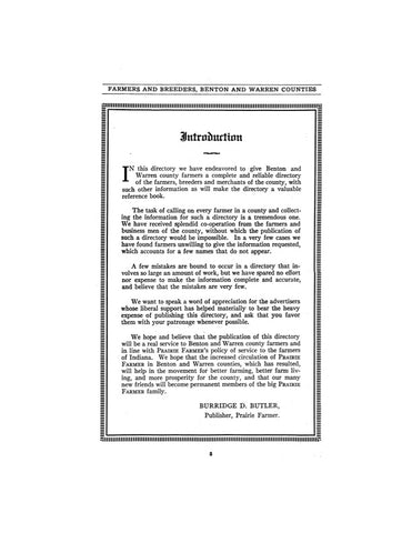 This book is a reliable directory of the farmers and the breeders from the counties of benton and Warren county Indiana.