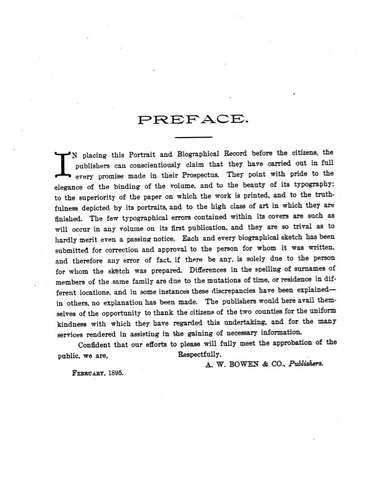 This book is a portrait and biographical record for the counties of Boone and Clinton county Indiana as well as biographical sketches of the prominent and representative citizens of the counties and portraits and biographical sketches of the Governors of Indiana and Presidents of the United States.