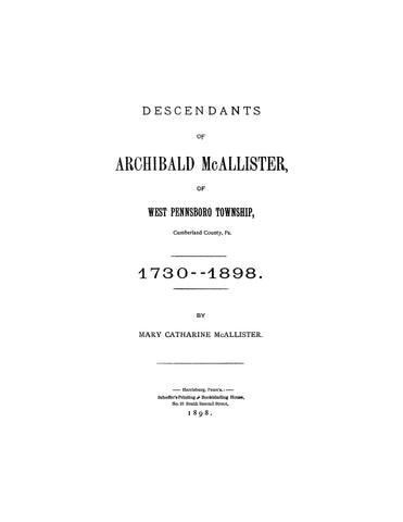 McALLISTER: Descendants of Archibald McAllister of W. Pennsboro Twp., Cumberland Co., PA, 1730-1898. 1898
