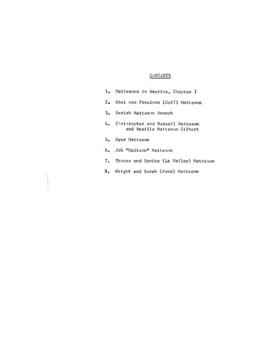 A publication that provides the Matteson family genealogies, with the history of the descendants of Henry Matteson (1646-1690), who emigrated to America in 1666/7. He was settled in Rhode Island. He married Hannah Parsons and they had seven children between 1670 and 1685. Henry died in 1690 and Hannah was remarried (to Charles Hazelton). The name has various spellings that include Mattison, Madison, Mattason, Matterson, Matson, and more. Includes Andrews, Briggs, Hood, Joslin, Weaver, Whitford and related families.